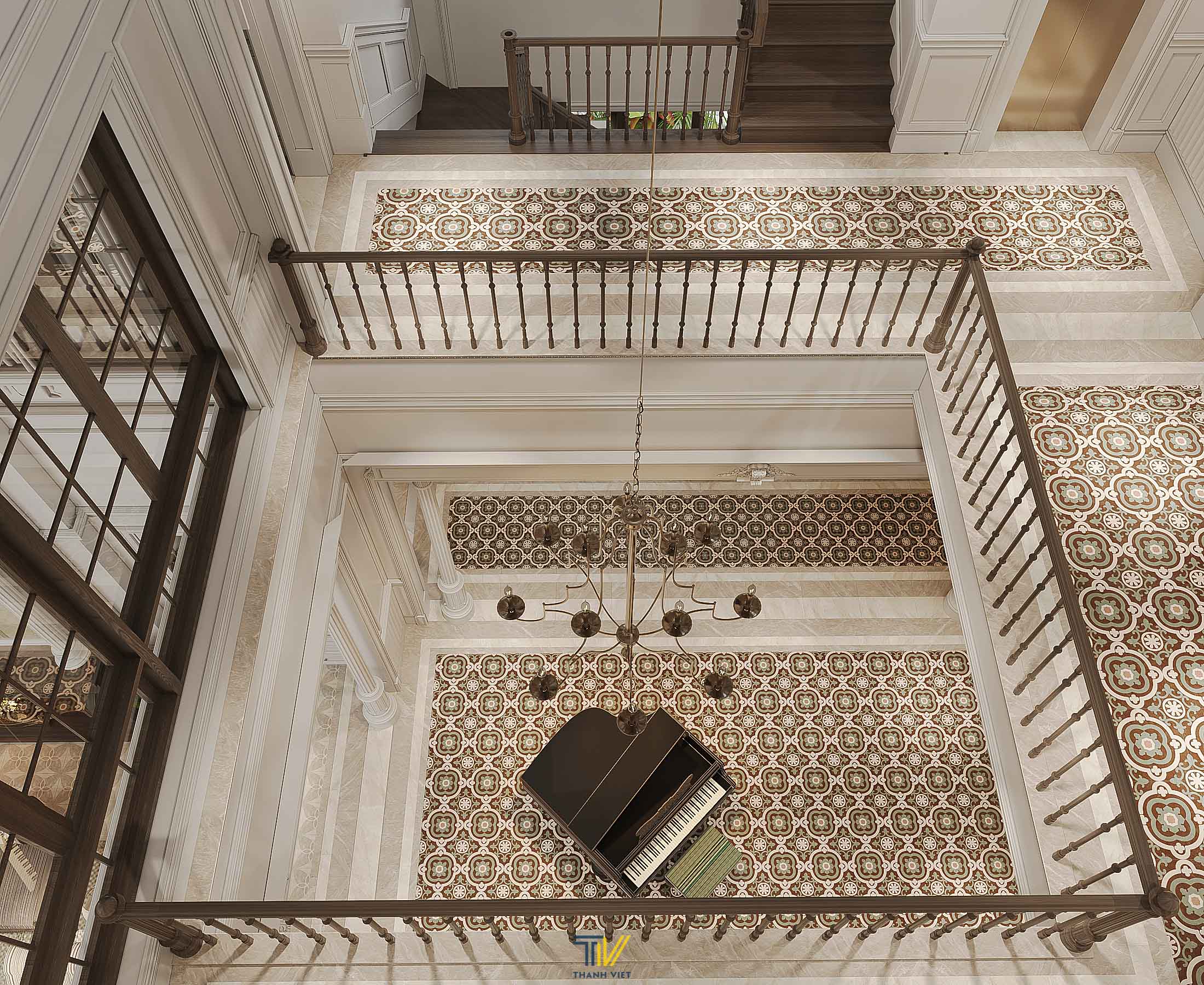 Khoảng thông tầng của căn biệt thự thực sự là điểm kết nối ánh sáng của toàn bộ căn nhà. Yếu tố Indochine cũng được thể hiện rõ tại đây với các chi tiết như sàn gạch họa tiết, tủ console, tranh trang trí và đèn rọi,…