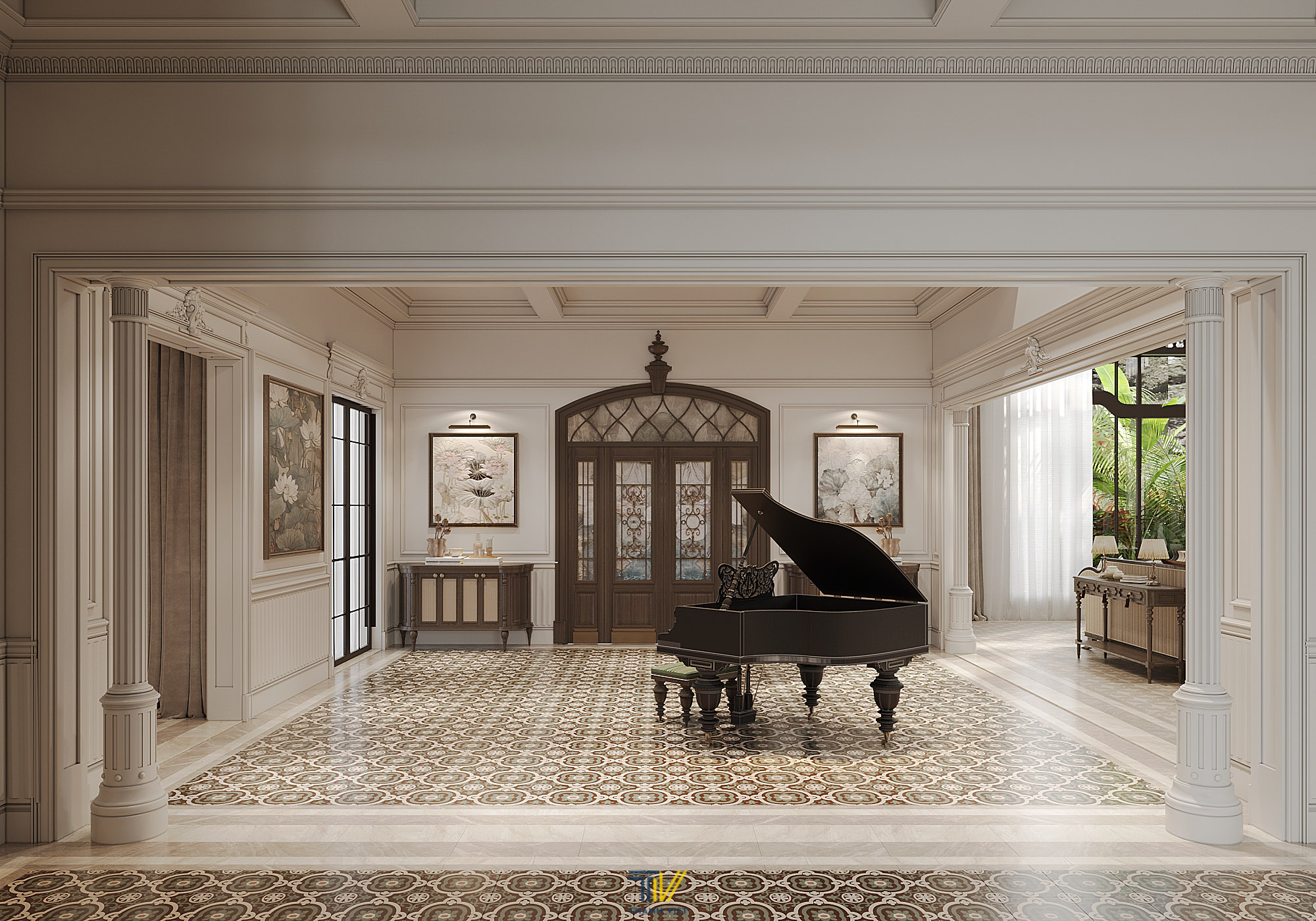 Tại Maison Villa, sảnh được thiết kế chỉn chu và đặc biệt mang tinh thần Indochine. Toàn bộ phần sàn được lát gạch họa tiết đặc trưng. Đặt giữa là chiếc piano lớn vô cùng ấn tượng. Tại đây cũng được bố trí tủ giày với thiết kế cách điệu, tranh tường hoa sen cùng những chi tiết phào chỉ bắt mắt cầu kỳ. Ngay từ khi đặt chân vào sảnh, có lẽ chúng ta đã phần nào đoán được phong cách chủ đạo cùng như sự đầu tư tâm huyết của gia chủ dành cho ngôi nhà.
