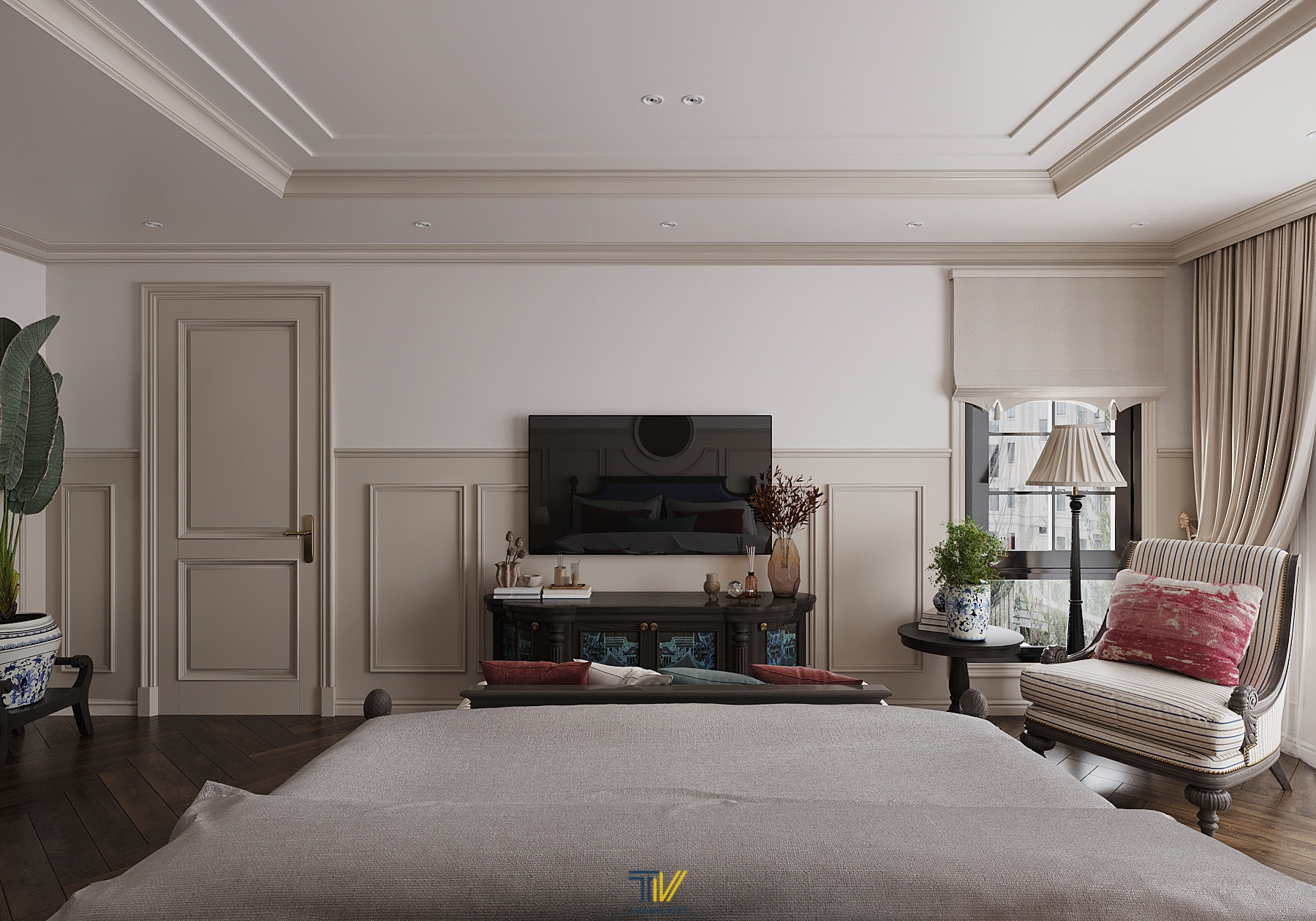 Căn phòng với tone màu trầm chủ đạo. Yếu tố Indochine được thể hiện rõ nét hơn qua các bức tranh họa tiết Á Đông, phào chỉ trần tường cầu kỳ,… Căn phòng cũng được nhấn nhá thêm sắc đỏ tạo sự ấm áp và có sức sống.