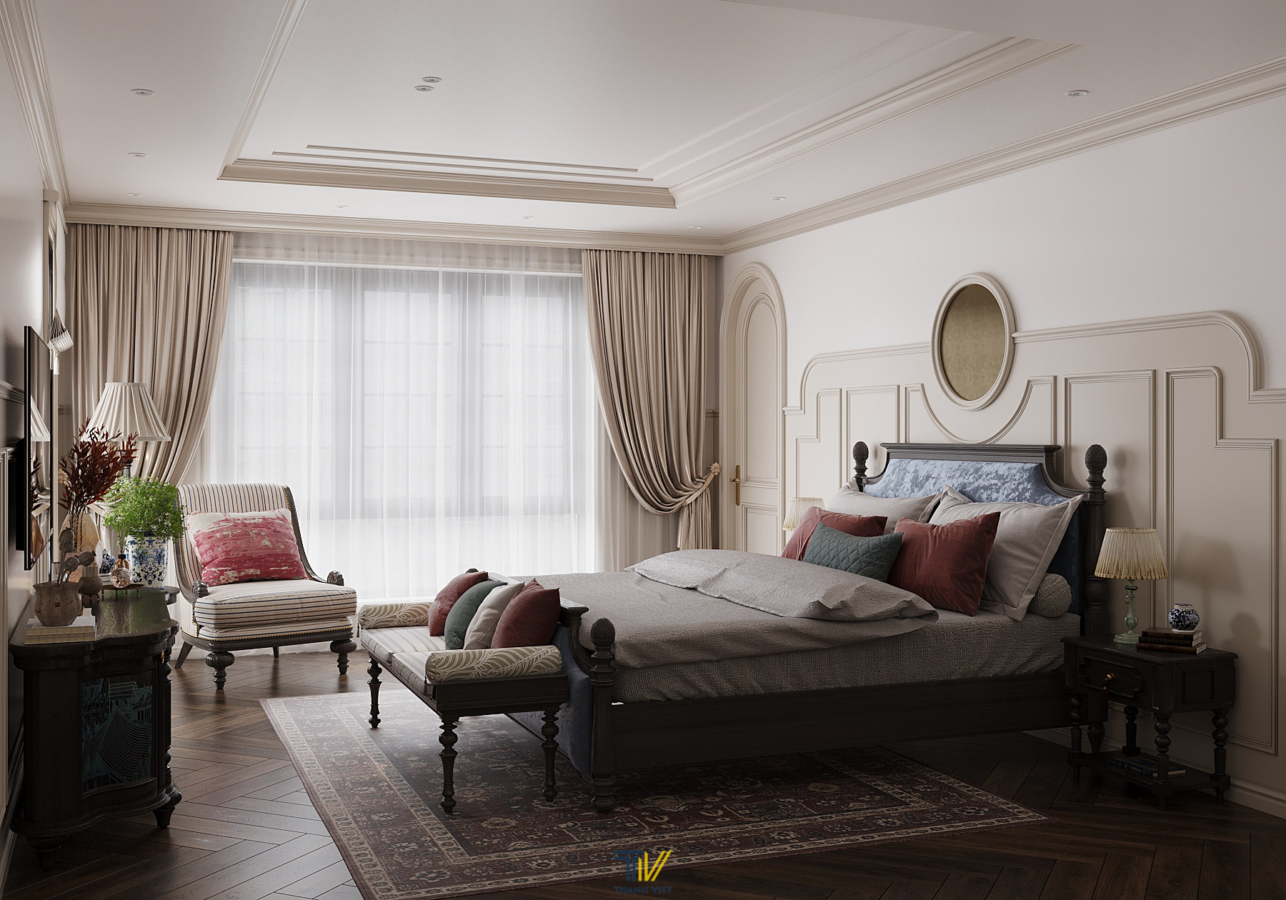 Đầu tiên là không gian ngủ mang đậm nét Indochine. Phòng có sự nhất quán bởi những chi tiết trang trí dựa trên sở thích của chủ nhà. Nội thất trong phòng cũng mang dấu ấn Á Đông đậm nét. Từ giường, ghế bench, bàn trà, ghế armchair đến những hệ tủ trang trí,… Với kiểu dáng cổ điển cùng màu gỗ nâu trầm, các món đồ giúp căn phòng thêm phần ấm áp và sang trọng. Tuy nhiên, điểm nhấn màu sắc và họa tiết luôn được chúng tôi thêm thắt. Giấy dán tường họa tiết, vải bọc nổi bật hay mặt bàn khảm xà cừ,… giúp căn phòng thêm phần nổi bật.