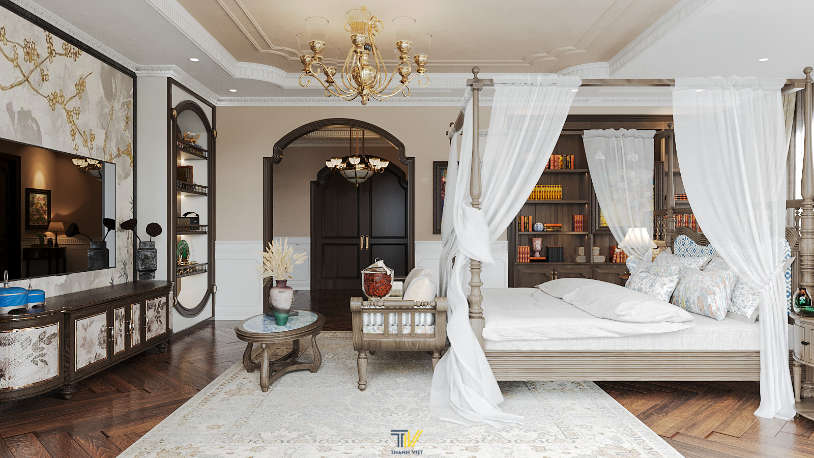 Các diện trần, tường sử dụng gam màu trắng kem kết hợp cùng màu gỗ óc chó nâu sẫm từ đèn chùm, khung vách và đồ nội thất. Chi tiết cột, vòm cách điệu lấy ý tưởng từ Châu Âu cũng phần nào giúp cho không gian phòng thêm phần thanh thoát.