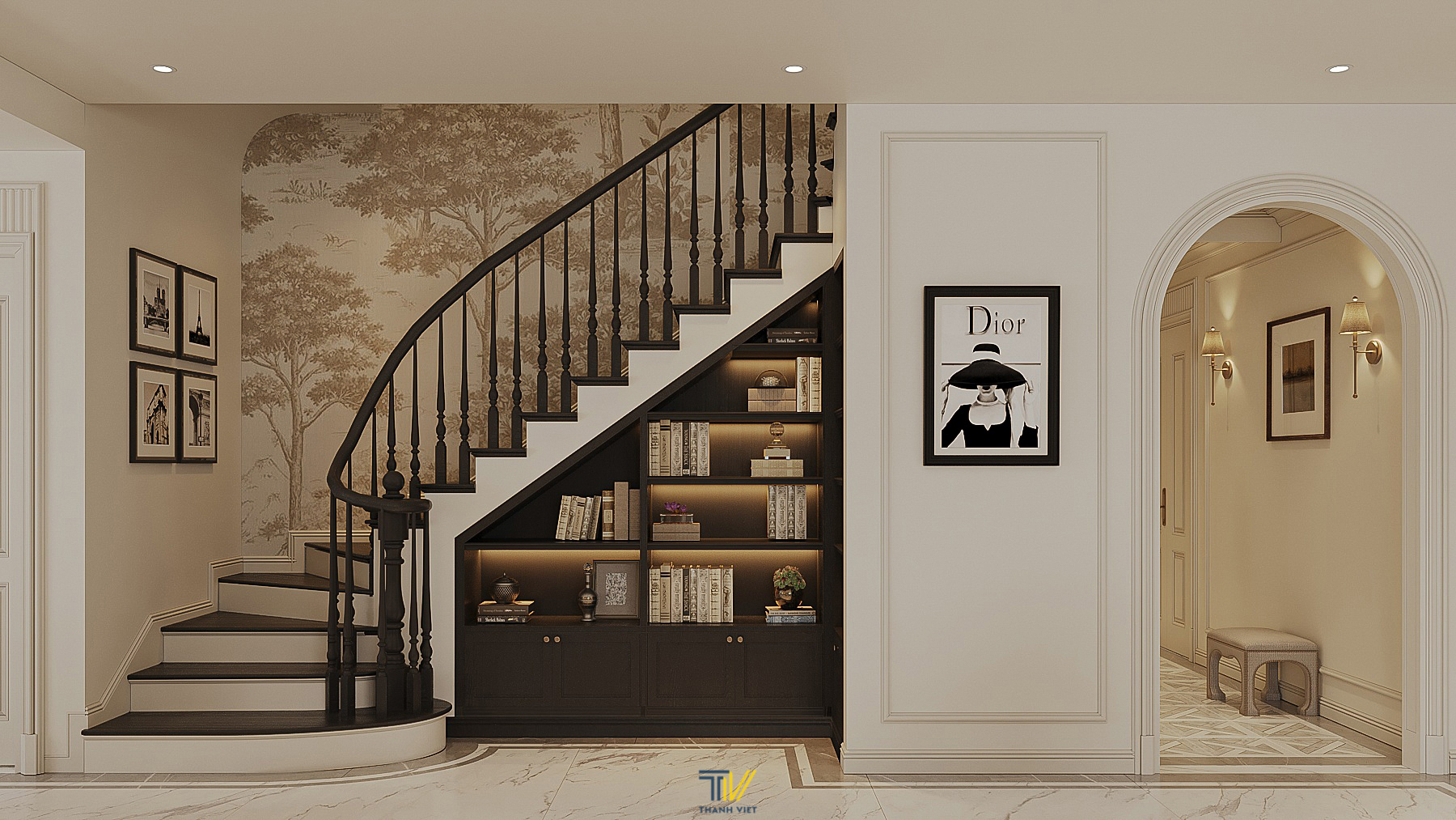Tận dụng gầm thang, KTS đã thiết kế thêm các chức năng để vừa đảm bảo tính thẩm mỹ mà vẫn đáp ứng công năng cho gia đình. 3 bậc thang đầu tiên đã được đắp thêm phần bo, tăng sự duyên dáng và mềm mại cho thang. Phần gầm được bố trí thêm tủ trang trí (mặt trước), mặt trong (Tủ kho) và mặt cạnh (Tủ giày) để tối ưu công năng sử dụng.