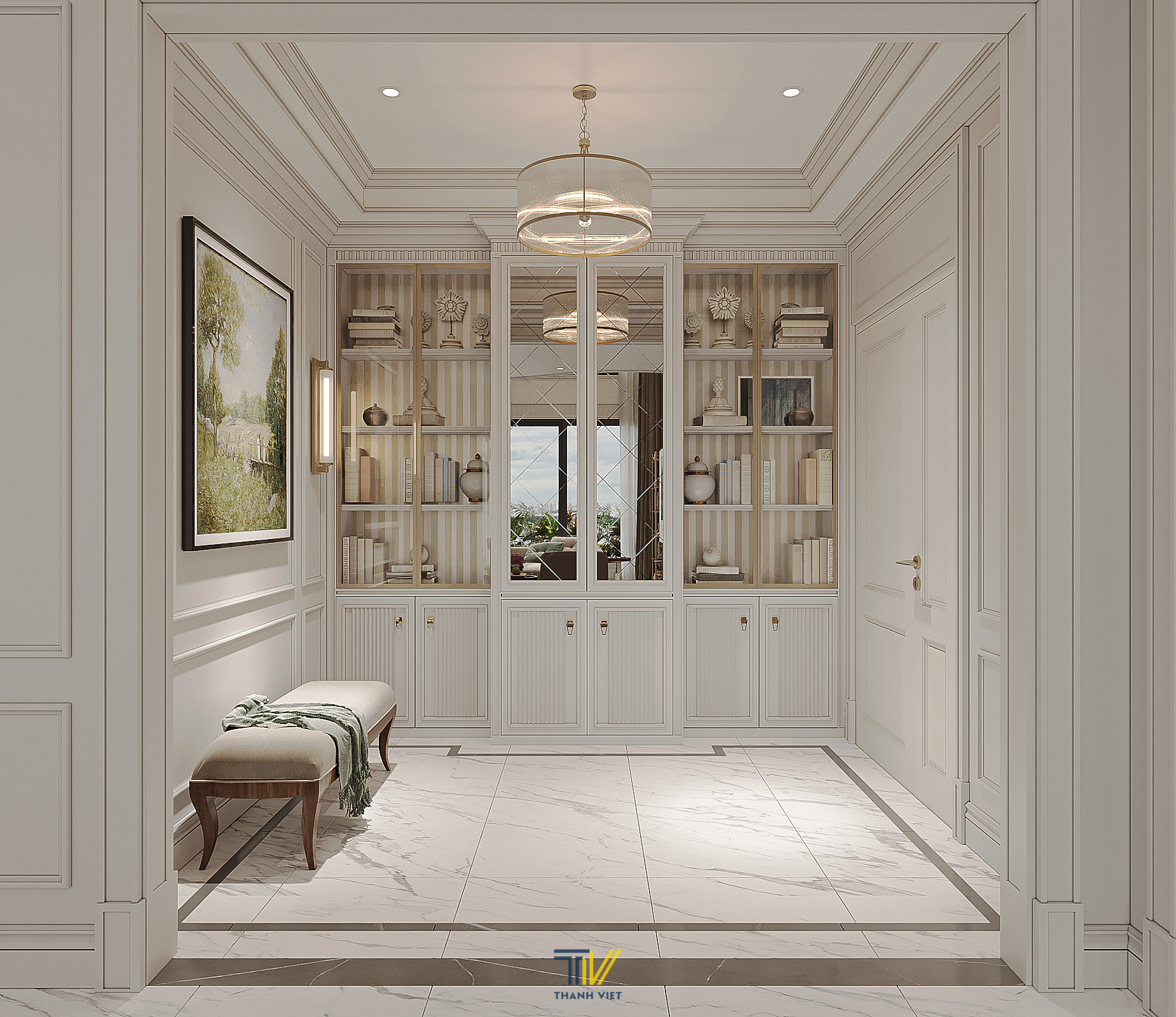 Phần tiền sảnh có sự thay đổi lớn về diện tích so với hiện trạng. Để tạo nên một “lời chào đầu” ấn tượng, KTS của Thanh Viet Interior đã bố trí tủ giày kèm trang trí lớn, bàn console, bench ngồi êm ái cùng tranh và đèn rọi. Mọi chi tiết đều được thêm vào tinh tế, mở ra cái nhìn đầu tiên về tổng thể phong cách căn nhà.