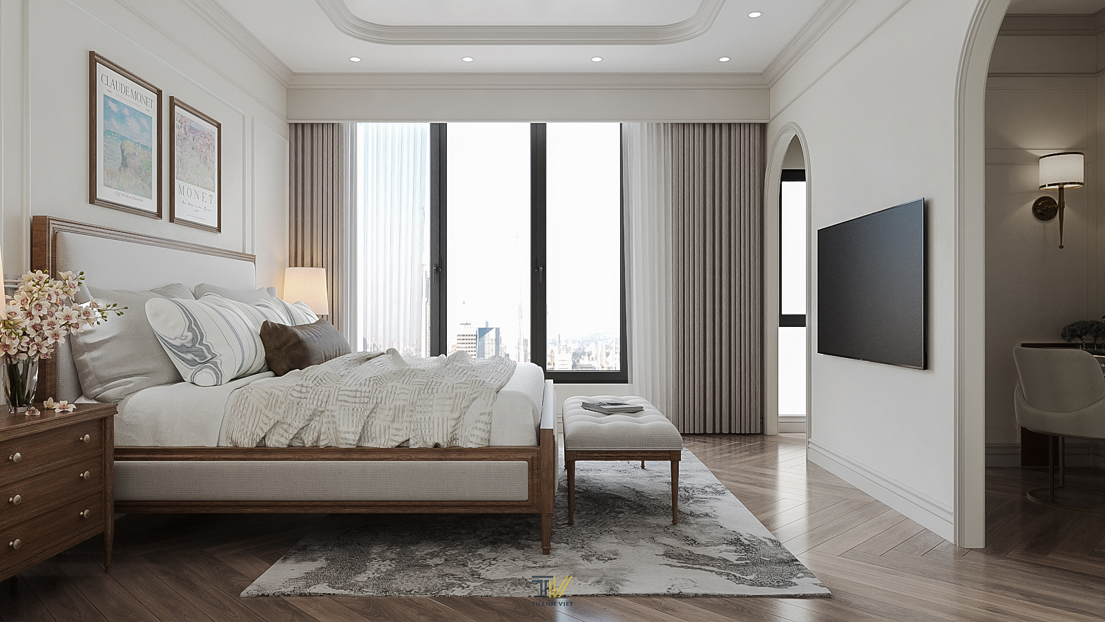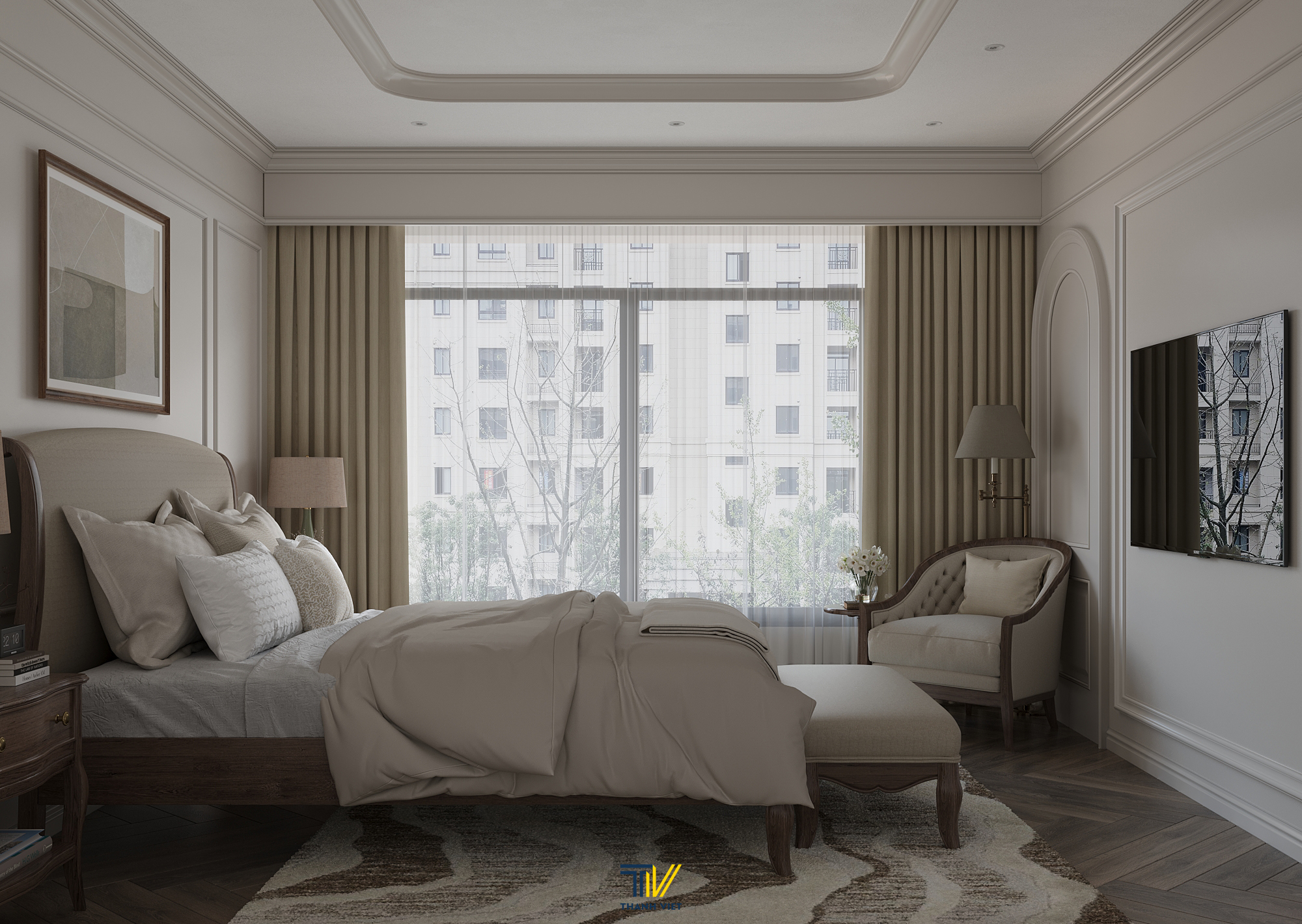 Trong khi các yếu tố cố định như trần, tường, sàn phảng phất hơi thở cổ điển với các biên dạng phào tinh tế. Thì đồ nội thất lại mang hơi hướng đương đại, điểm xuyết tinh thần thời thượng và trẻ trung.